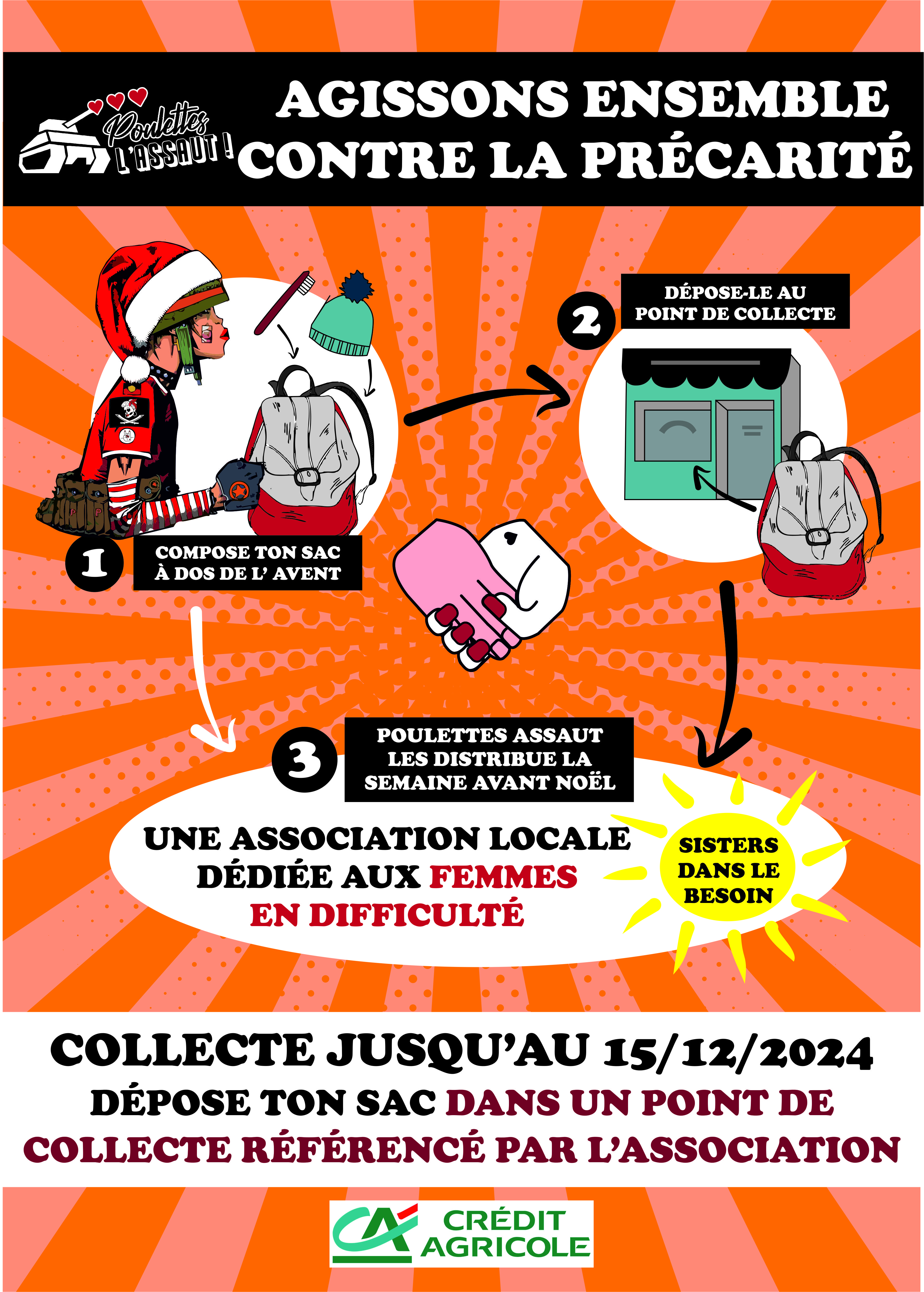 Chaque fin d’année, elle organise notamment la grande collecte « des sacs de l’avent » : ces sacs contiennent des produits d’hygiène, des gourmandises et des cadeaux de fin d’année qui apportent un peu de chaleur aux femmes en situation précaire en centre d’hébergement d’urgence ou maisons des Femmes.