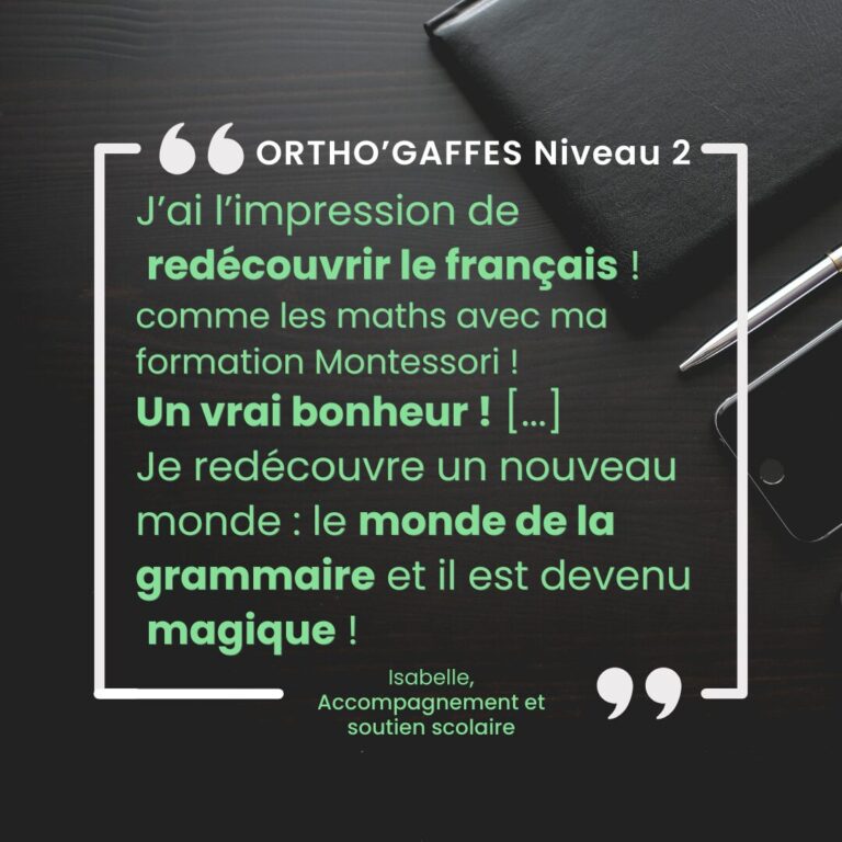 Proposé par Pédago’Vie, ORTHO’GAFFES n’est pas un simple ensemble d’exercices. Ce programme se distingue par une approche axée sur le quotidien, avec des outils utilisables de façon informelle et ludique. La formation est accessible en e-learning, un format idéal pour les familles et les professionnels cherchant des solutions flexibles, ainsi qu’en présentiel et distanciel pour ceux qui souhaitent une approche plus interactive.