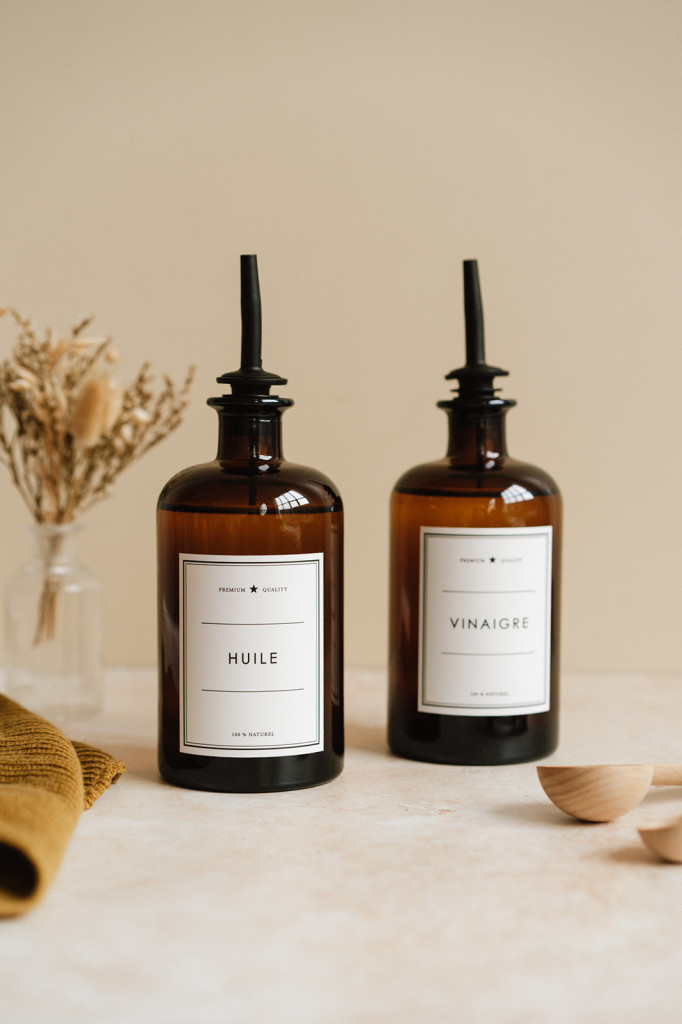 - 1 Bouteille en verre Vinaigre 500 ml Blanc et son bec verseur lesté doré ;