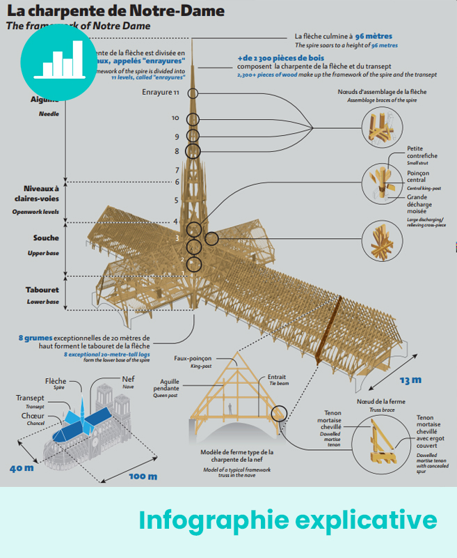 - Infographies pour l’exposition sur Notre-Dame : un travail minutieux pour expliquer de manière visuelle et pédagogique les différentes étapes de rénovation ;