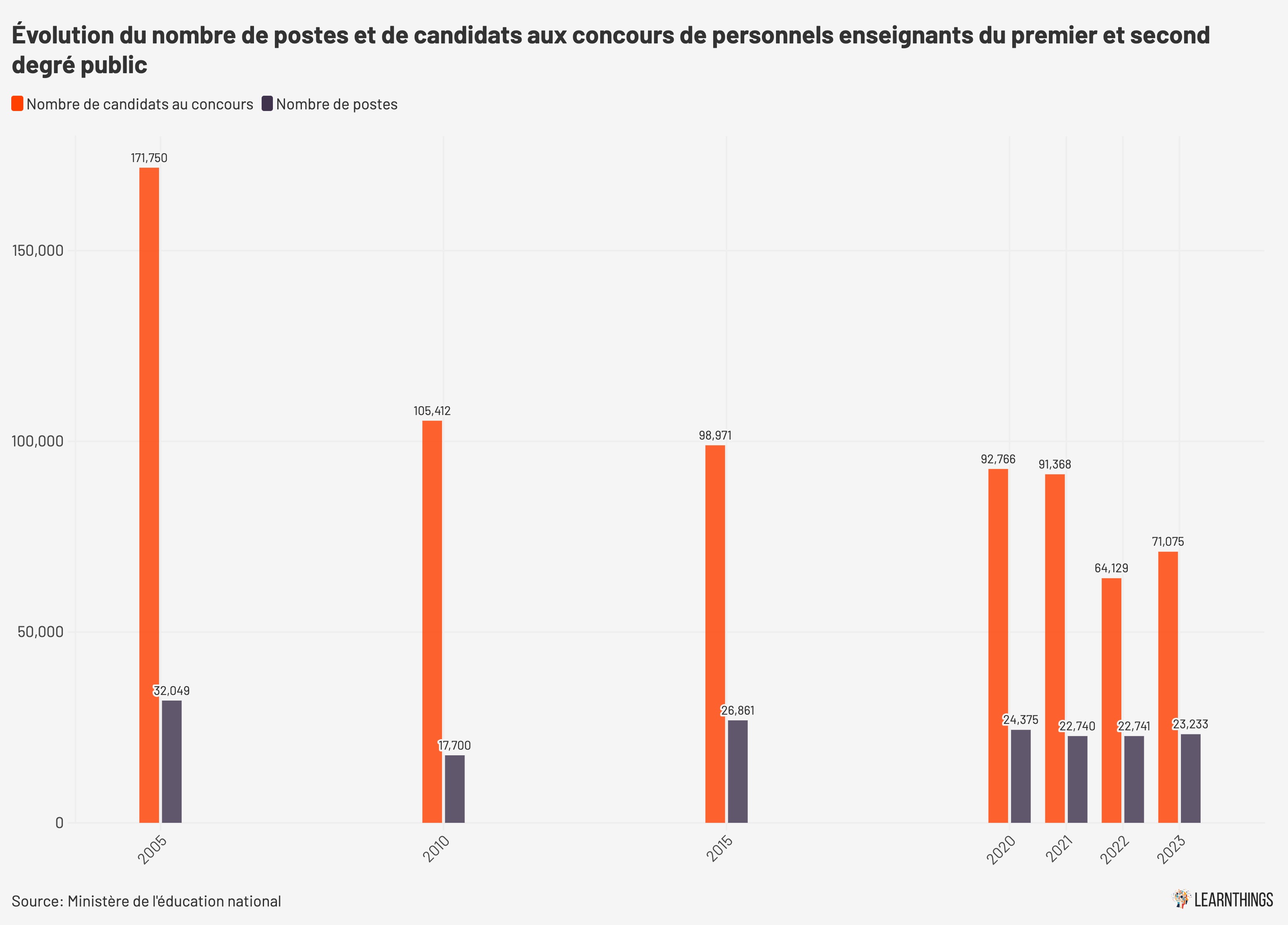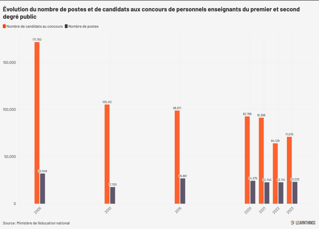 - Une pénurie d’enseignants persistante : Entre 2005 et 2023, les candidatures aux concours ont chuté de près de 59 %, laissant 3 100 postes vacants en 2023. Ce manque fragilise les établissements, particulièrement dans les zones défavorisées ;