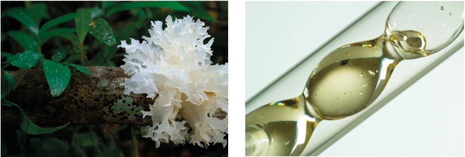 Ce champignon a été exploité grâce à un procédé qui assure une extraction optimale, tout en respectant les principes de durabilité, et qui garantit une teneur minimum en acide hyaluronique de 80 %.
