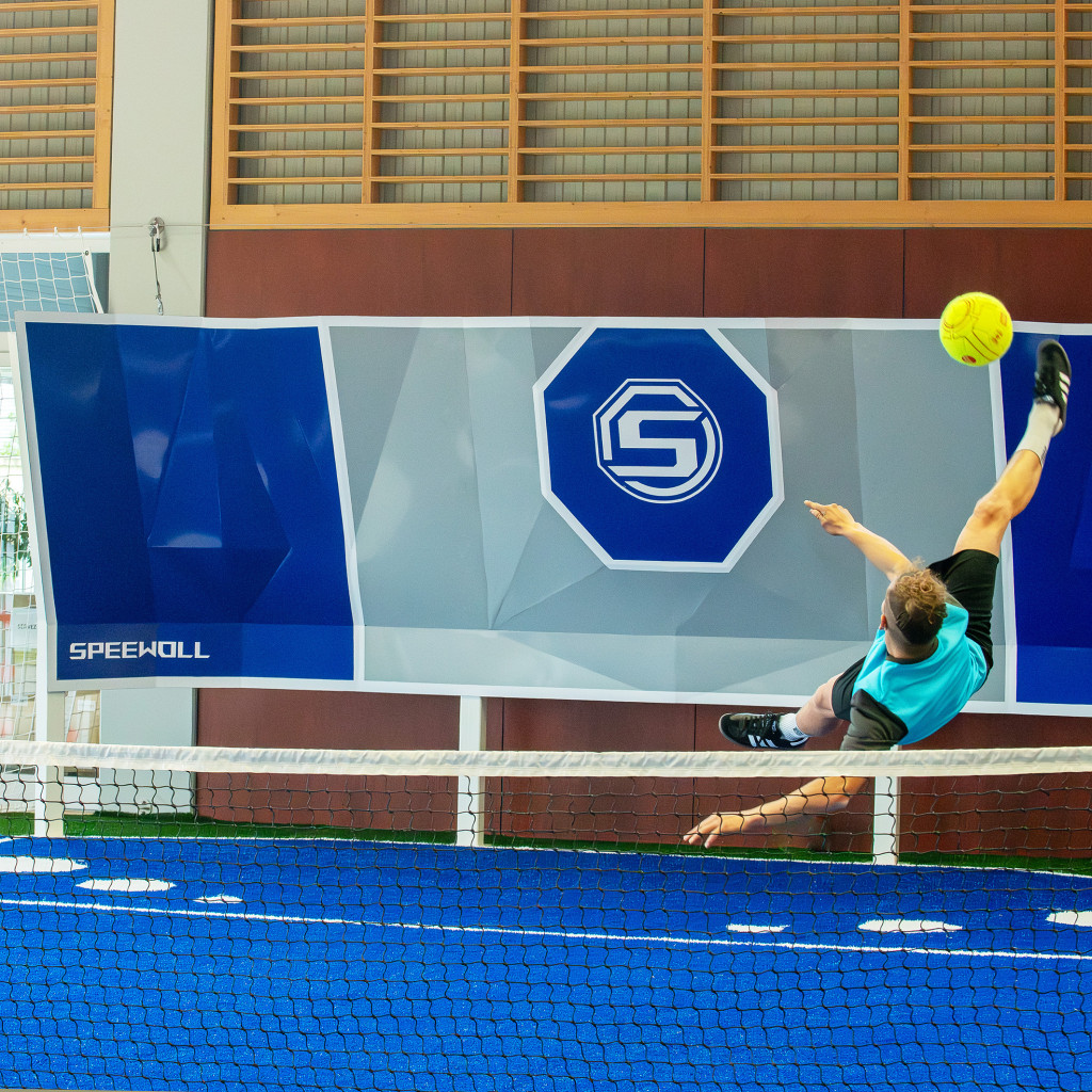 Le SPEEWOLL se joue sur un terrain de 16,80 mètres sur 7,50 mètres, entouré de deux panneaux inclinés intégrant des formes géométriques en “origami”. Ces surfaces de renvoi imprévisibles ajoutent une dimension stratégique inédite au jeu : chaque rebond devient une opportunité mais aussi un défi, obligeant les joueurs à développer une lecture rapide du jeu et une précision chirurgicale dans leurs frappes.
