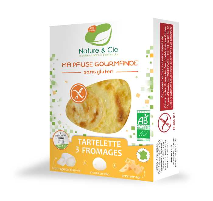 Focus sur la Tartelette trois fromages, ou le parfait exemple d’une nourriture gourmande, savoureuse, de qualité et sans gluten ! Mozzarella, emmental et fromage de chèvre sont réunis sur une pâte fondante. A réchauffer 4 minutes au four à 190°C.