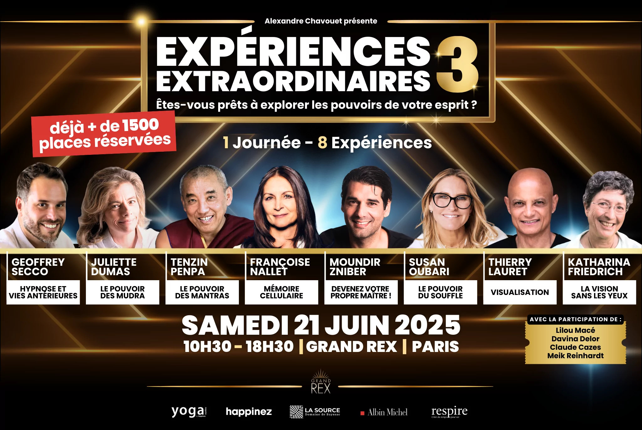 Le 21 juin 2025, Expériences Extraordinaires 3 investit le Grand Rex de Paris pour une journée immersive consacrée aux pouvoirs insoupçonnés de l’esprit humain. Près de 2700 participants y découvriront, guidés par des experts internationaux, une série d’expériences interactives mêlant hypnose, respiration, méditation, exploration sensorielle et connaissances scientifiques, dans une scénographie pensée comme un voyage intérieur.