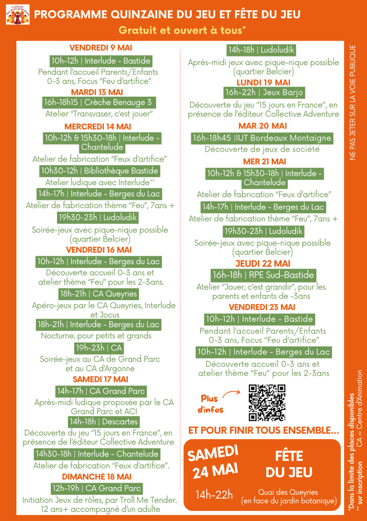 Du vendredi 9 au vendredi 23 mai 2025, la Quinzaine du Jeu précède la journée phare. Durant ces deux semaines, différents acteurs ludiques bordelais proposeront gratuitement des ateliers découvertes, des soirées jeux et des initiations variées, invitant la population à découvrir et expérimenter les jeux dans un cadre convivial.