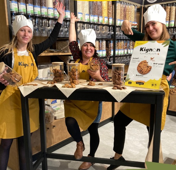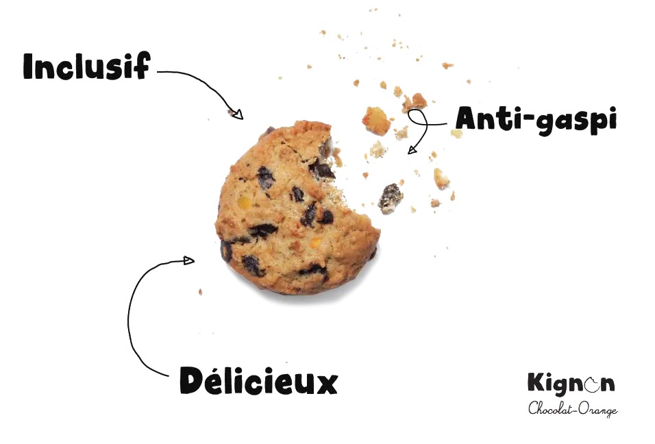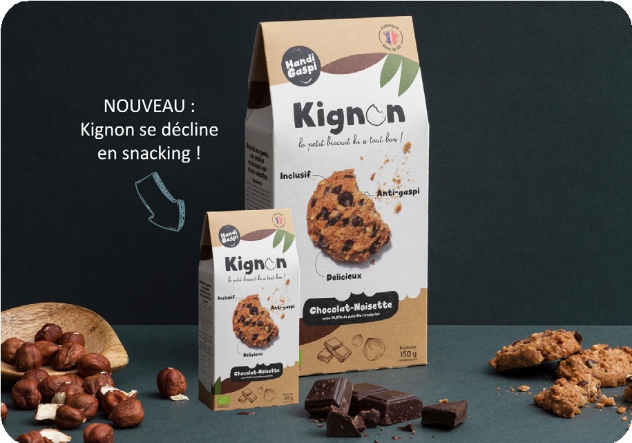 Son produit phare : Kignon, un délicieux petit biscuit inclusif et anti-gaspi. Fabriqué en Loire-Atlantique par des personnes en situation de handicap, il est élaboré à partir d’invendus de pains bio et d’ingrédients locaux & équitables.
