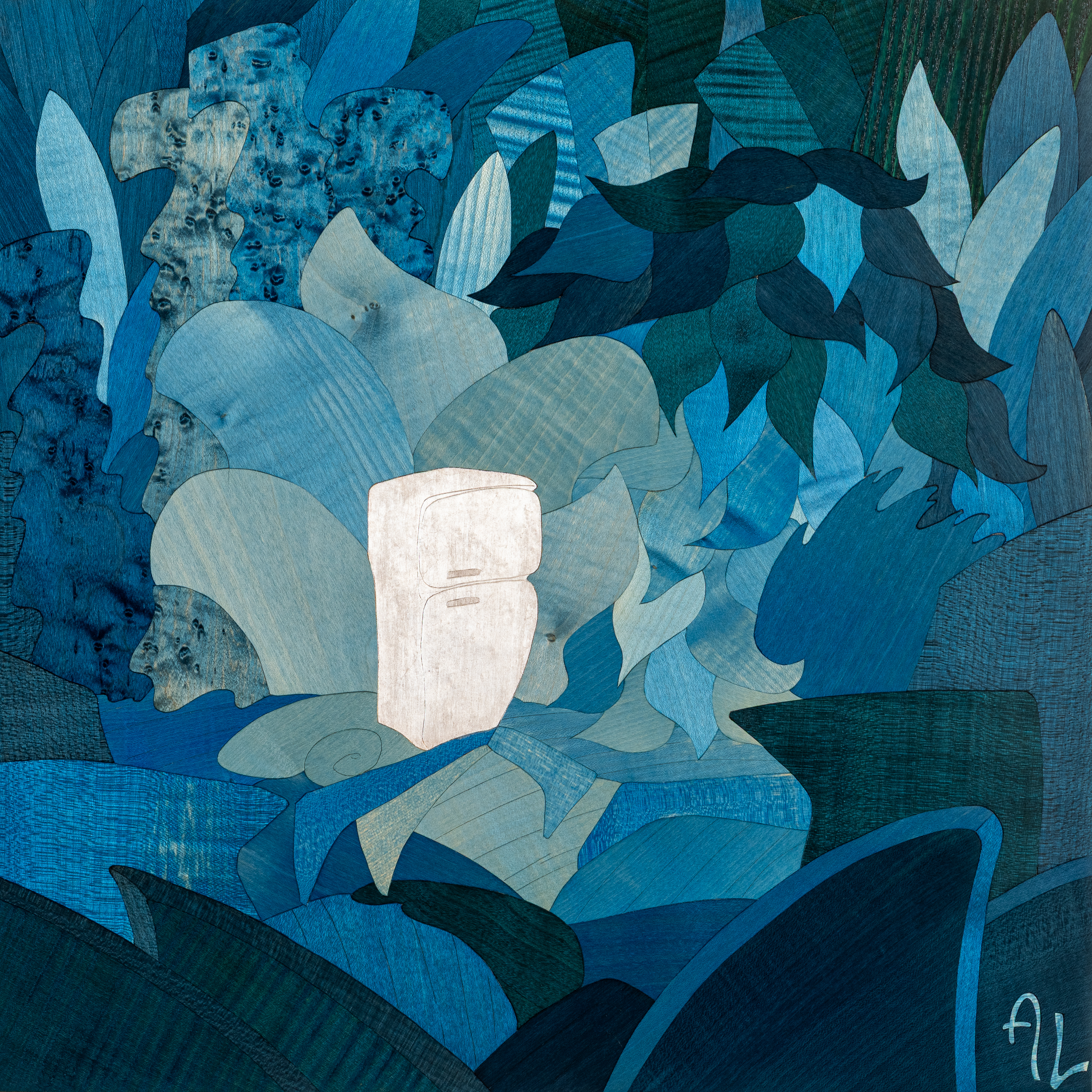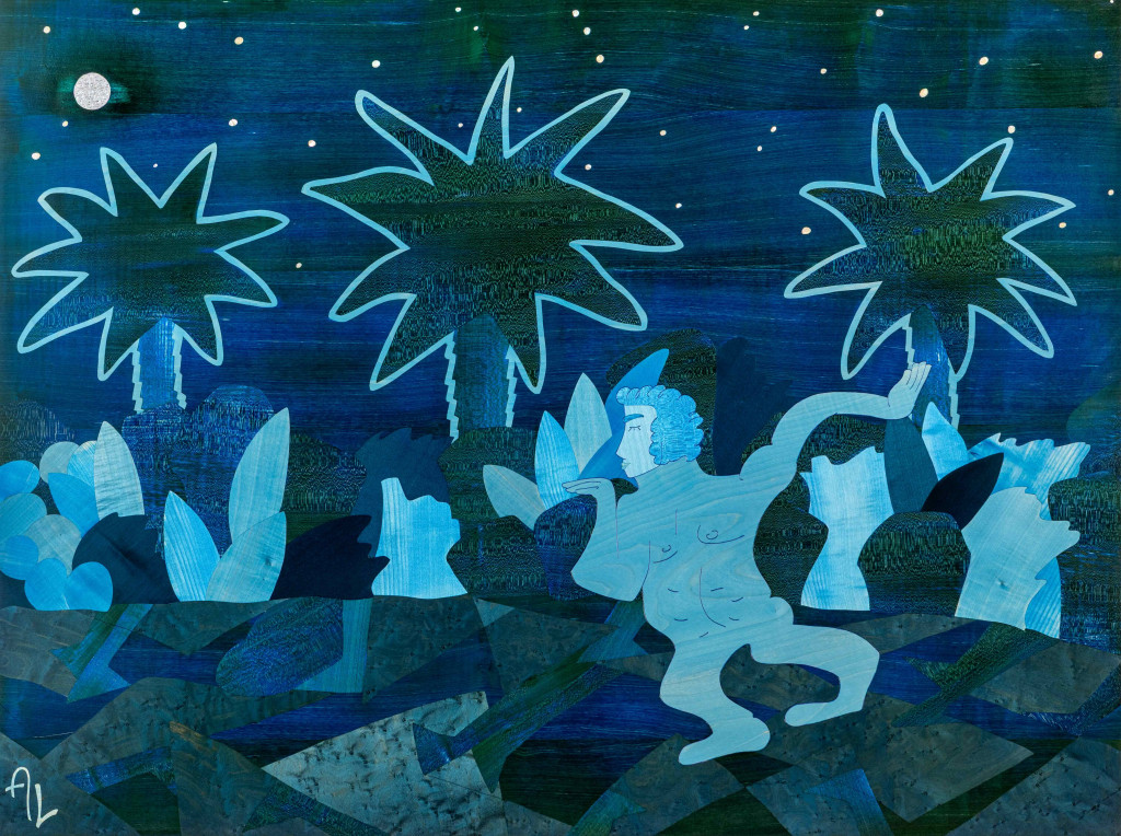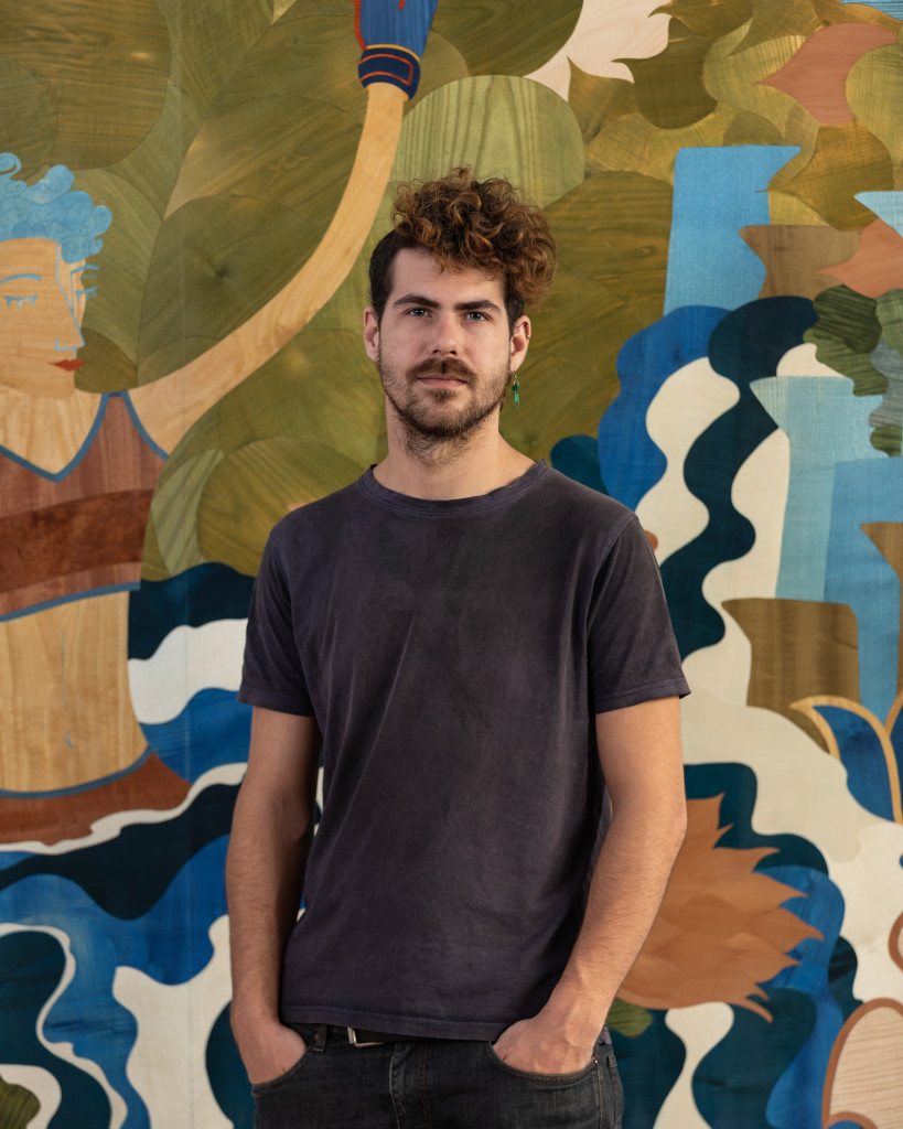 Anton Laborde n’a pas choisi la marqueterie par hasard. Il s’y initie dès l’âge de 15 ans, auprès des Compagnons du Tour de France, et apprend les gestes fondateurs aux côtés du marqueteur d’art Dominique Ciamarone, Meilleur Ouvrier de France. Très tôt, il comprend que cette technique ancienne peut devenir un langage contemporain. En résidence chez le designer irlandais Joseph Walsh, il affine cette intuition : détourner l’artisanat pour l’inscrire dans une narration critique, sensible, poétique. Son enfance passée à Auroville, cité expérimentale fondée en 1968 sur une terre désertifiée du sud de l’Inde, nourrit en profondeur sa manière de voir le monde. Là-bas, les utopies collectives, la spiritualité laïque et la confrontation à un environnement recréé ont laissé des empreintes. Mais Anton Laborde s’en détache : “Je ne fais pas de la nature un sujet, mais un terrain d’écriture”, semble-t-il dire à travers ses œuvres. Les références picturales sont nombreuses : Rousseau pour les atmosphères végétales, Klimt pour les compositions denses, Botticelli pour la finesse des figures, Van Gogh pour l’énergie de la matière. Mais rien n’est citation, tout est réinvention. Laborde compose sa propre mythologie, où le bois, teinté ou brut, est la matière première d’un théâtre mental. Ses œuvres lui valent plusieurs distinctions précoces : Prix des Compagnons (2017), Prix national du Concours Général des Métiers et Prix du Rotary Club (2018), Prix Jeune Création des Métiers d’Art – Ateliers d’Art de France (2022). Son travail a été salué dans la presse spécialisée (Financial Times, IDEAT, ELLE Décoration, Le Figaro). Depuis 2019, il vit et travaille dans le Sud-Ouest de la France.