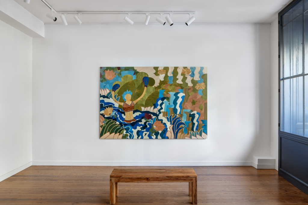 Dans les compositions de Laborde, la jungle n’a pas de frontière. Elle envahit tout, sans cadre ni hiérarchie. Elle devient territoire d’ambiguïté, espace de cohabitation entre le vivant, l’objet manufacturé, et la figure humaine. Ces dernières – souvent féminines, les yeux clos – flottent en apesanteur dans un écosystème saturé. Elles sont présences silencieuses, presque sacrées, qui incarnent le repli, l’intimité, mais aussi la résistance.