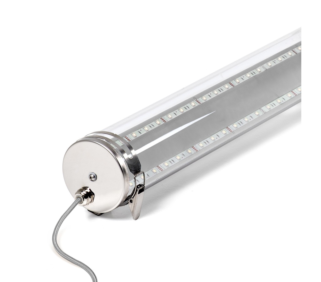 Caractéristiques : enveloppe en méthacrylate et polycarbonate, inox 316L, protection IP68, norme IK10