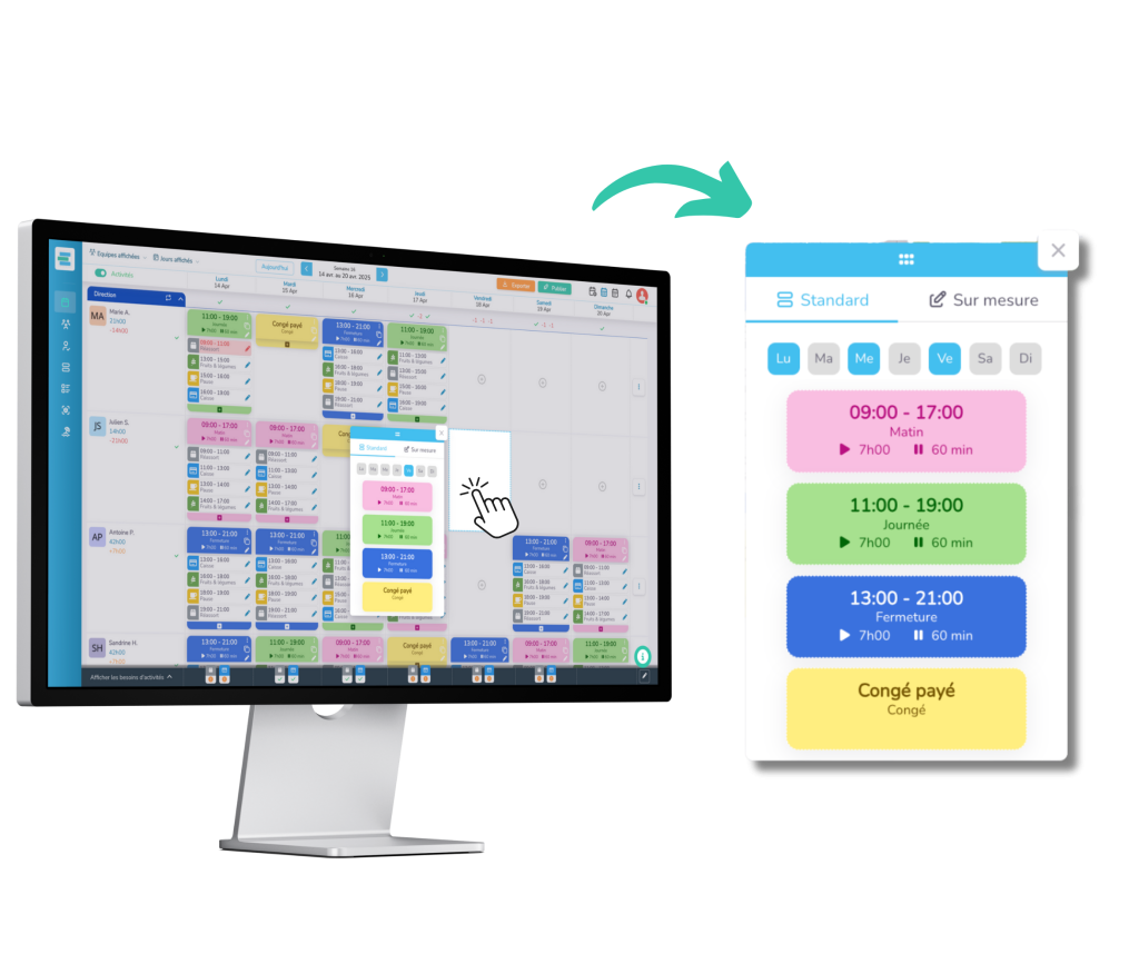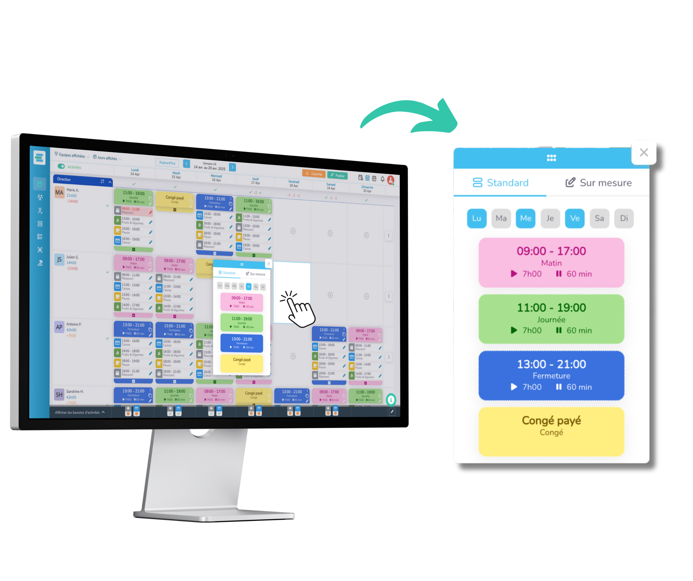 En 2 clics, le système de drag & drop et de copier/coller intuitif permet de réorganiser les shifts (= périodes de travail définies pour les employés). Les plages horaires peuvent aussi être découpées en plusieurs activités (ex : 4h en caisse + 2h au rayon),
