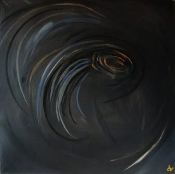 Cette peinture en acrylique, de 100×100 cm, exprime la beauté, le silence, l’obscurité et la poésie de la voie lactée, cette surface infinie sans cesse en mouvement.