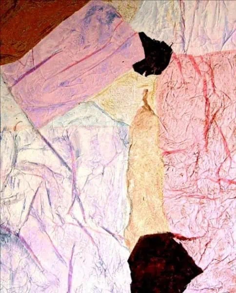 Ce tableau utilise une technique mixte : papier, soie et mûrier marouflés sur toile. Il mêle pigments et huile, ainsi qu’un vernis de protection.