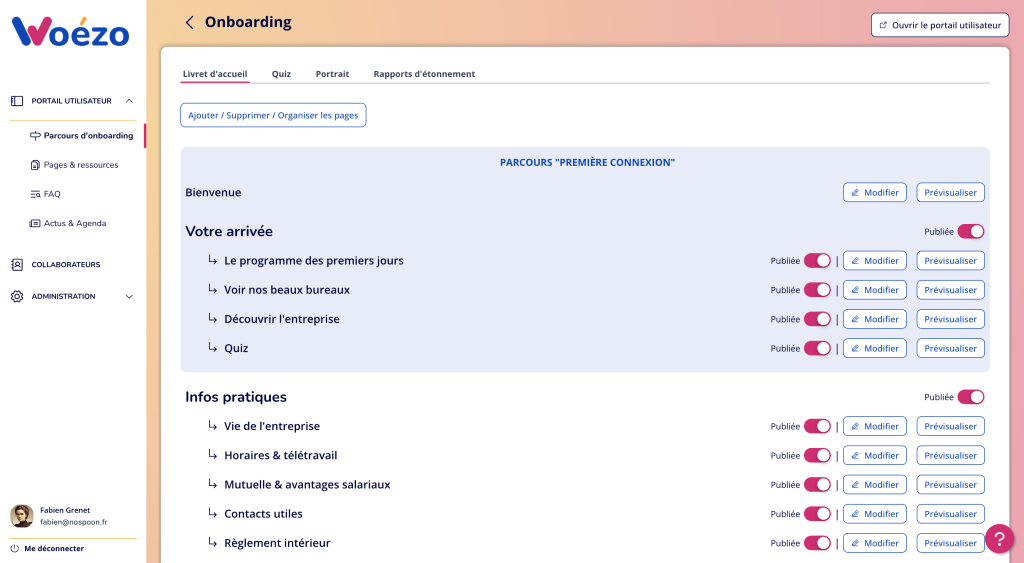 Le choix du parcours d’intégration digital comme première brique repose sur sa valeur immédiate, sa simplicité de mise en œuvre et son impact élevé sur l’engagement salarié. Loin d’un PDF figé, Woézo propose une expérience interactive et personnalisable pour chaque nouveau collaborateur.