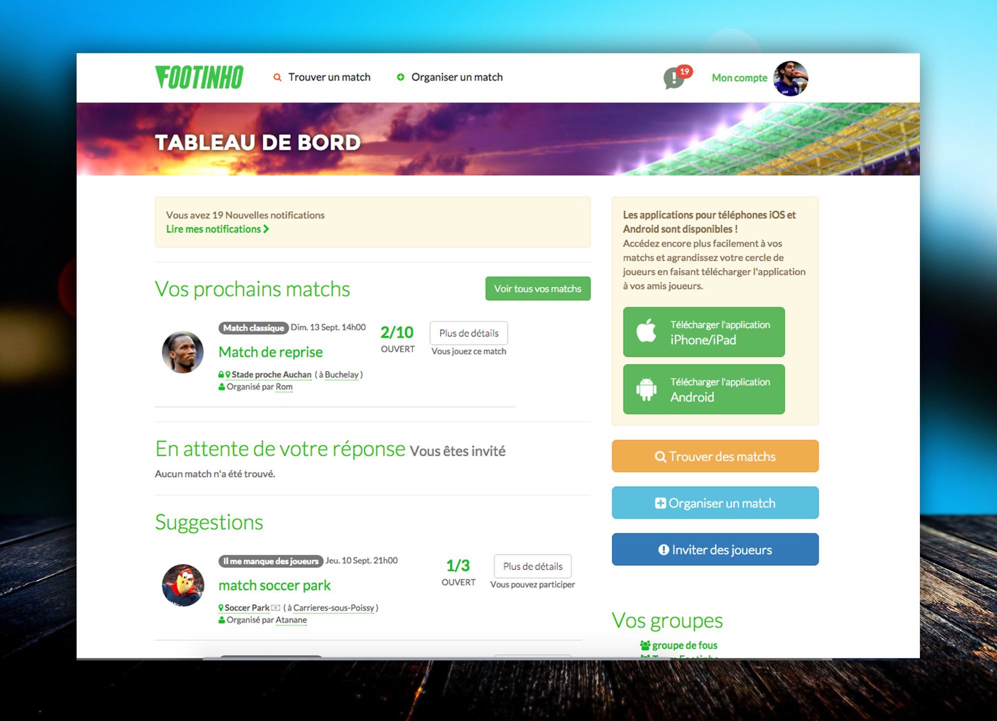 Notre objectif est que Footinho soit dans la poche ou sur le PC de tous les joueurs réguliers comme occasionnels, et que des joueurs s’initient ou jouent plus régulièrement au foot grâce à cette application et sans les contraintes d’un club.