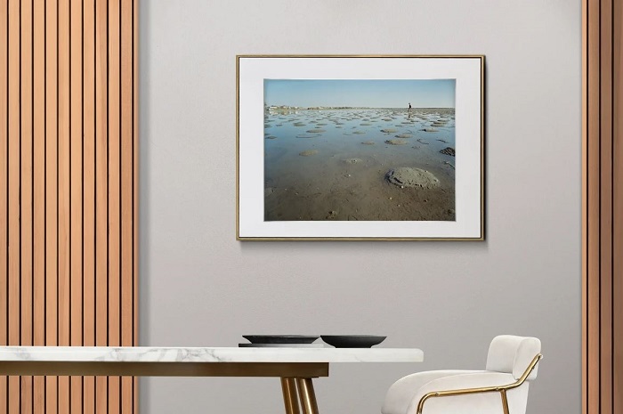Un paysage texturé, vibrant de lumière et de matière, qui évoque les éléments fondamentaux : terre, air et sel. Minimaliste, cette œuvre révèle la force tranquille du rivage.