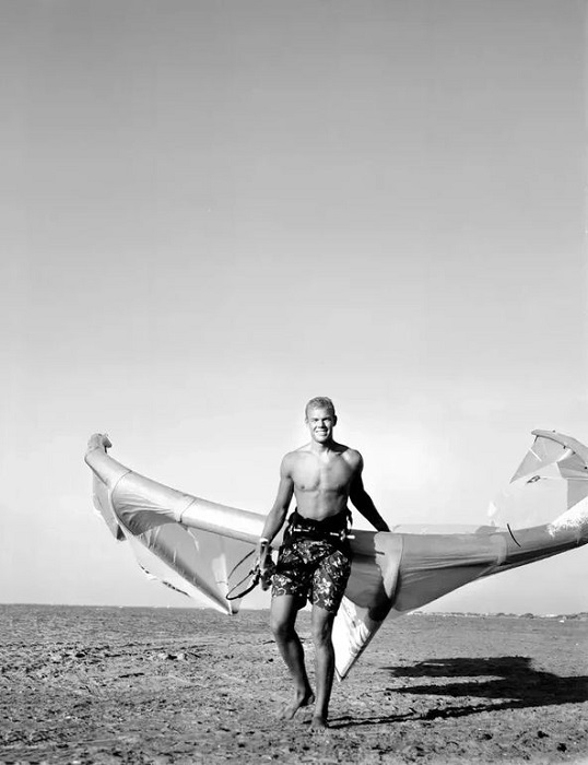 Une photographie noir et blanc aérienne et poétique, capturant un instant suspendu entre ciel et sable.