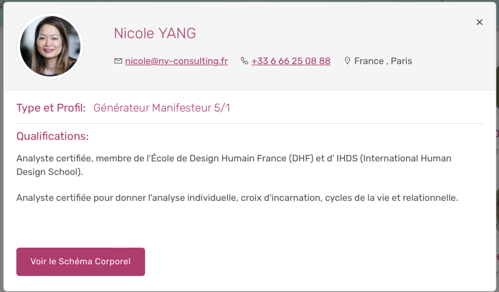 - Analyses personnalisées de Design Humain : qu’il s’agisse d’explorer sa carte individuelle, de comprendre ses cycles de vie ou encore d’analyser ses relations professionnelles et personnelles, ces bilans permettent d’obtenir une vision claire de son fonctionnement. Concrètement, les clients repartent avec des clés pratiques pour prendre de meilleures décisions, améliorer leur communication et créer des relations plus fluides.