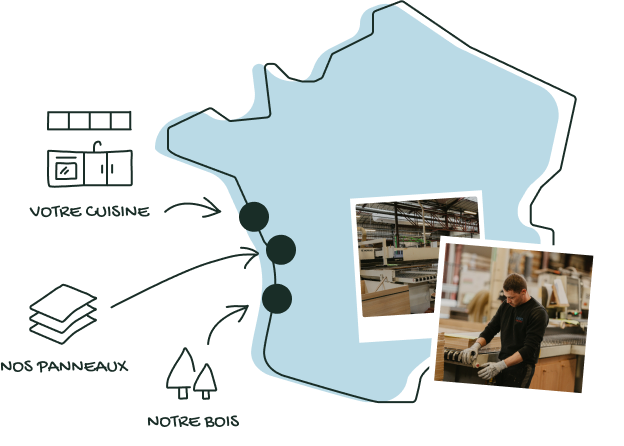Boma s’engage et fabrique chaque cuisine dans son atelier indépendant, aux Landes Genusson, en Vendée, sans intermédiaires et dans une logique de circuit court. Les meubles sont composés de bois recyclé (issus de meubles, palettes ou chutes locales) et le reste provient de forêts landaises, gérées durablement.
