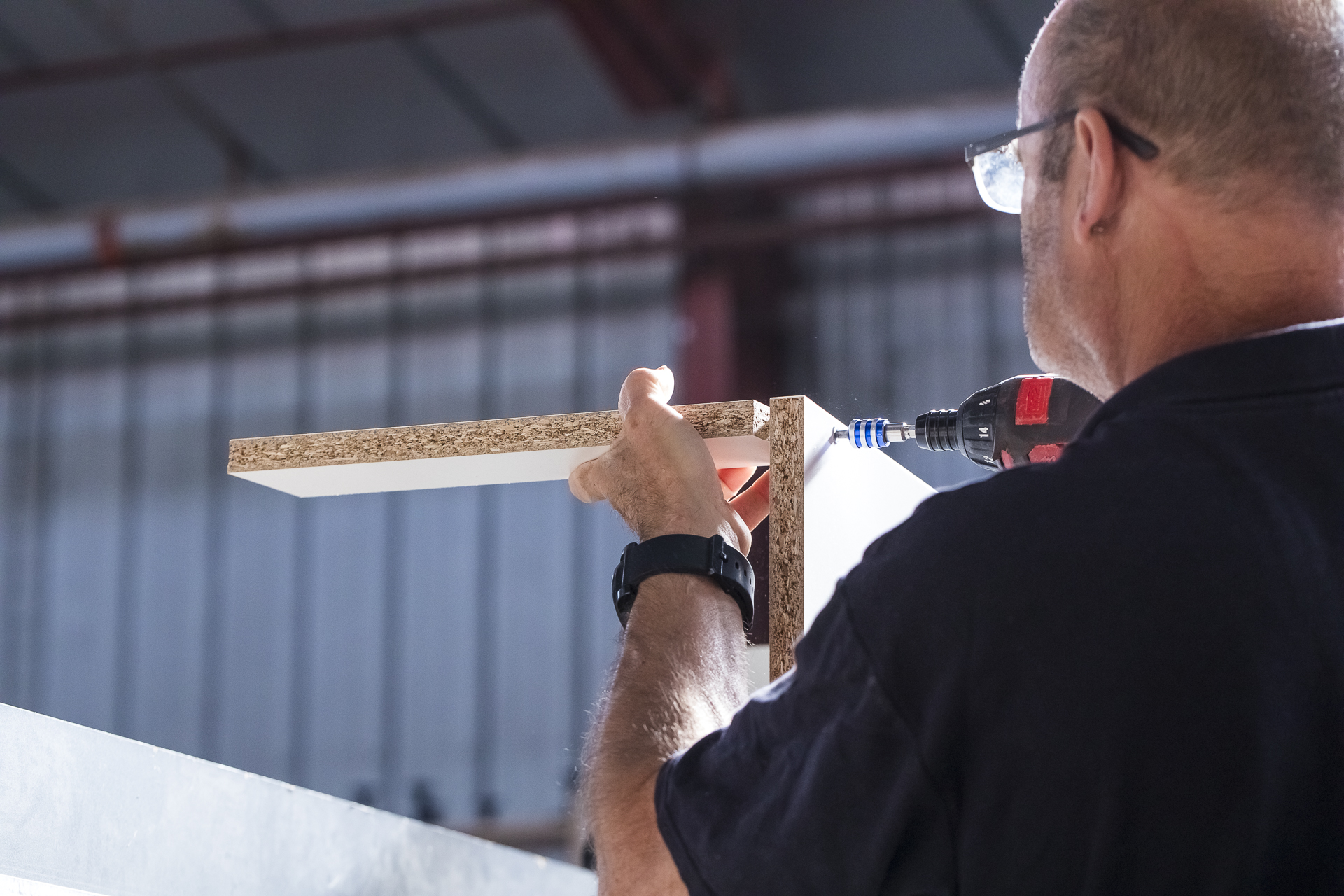 Ce modèle local permet non seulement de soutenir l’économie régionale, mais aussi de proposer des produits de qualité supérieure, avec des matériaux résistants et réparables : épaisseur de 19 mm pour l’intégralité des meubles de la façade au fond des caissons, haute densité ≥ 600 kg/m³, meubles vissés et non collés permettant la réparation ou le changement d’une seule pièce.