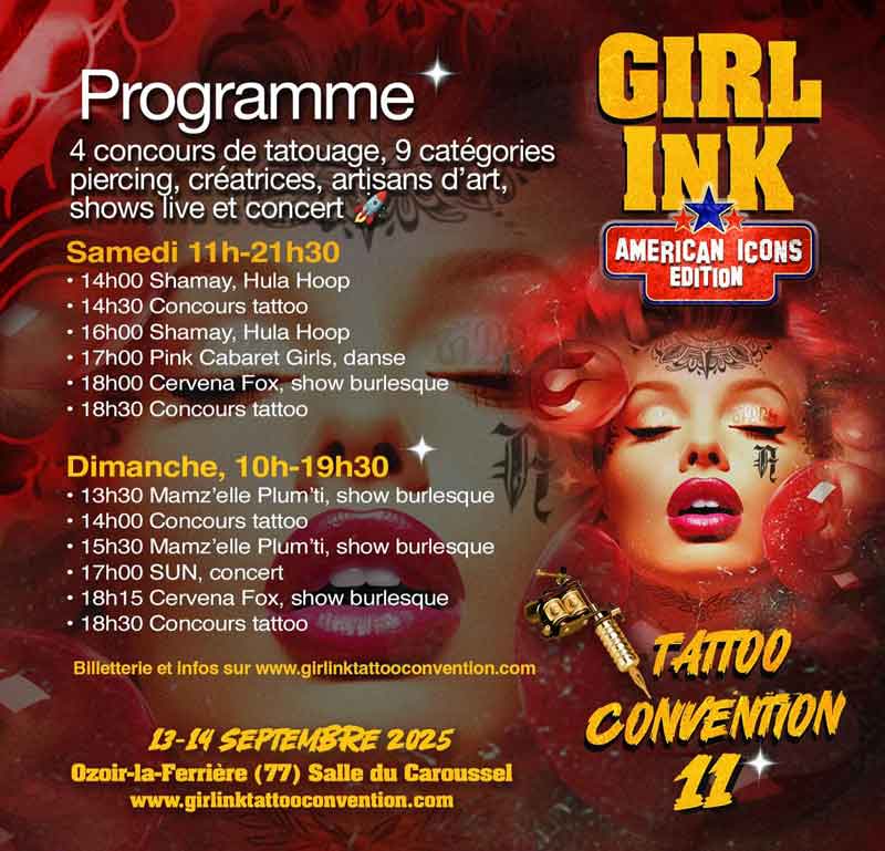 Créée en 2014, seule convention française 100 % tatoueuses, Girl’Ink revient les 13 & 14 septembre 2025 à Ozoir-la-Ferrière pour une 11e édition attendue, explosive, radicalement libre.