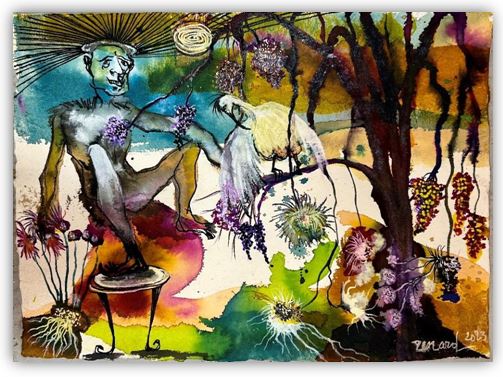 Ses influences sont nombreuses et rejaillissent de chacune de ses œuvres ; le classicisme d’un bouquet, la cruche renversée d’une nature pas si morte, un personnage évoquant David de Donatello, et toujours cette vibration qui nous emporte vers quelque chose d’inédit, d’ébouriffant, d’incroyablement vivant.