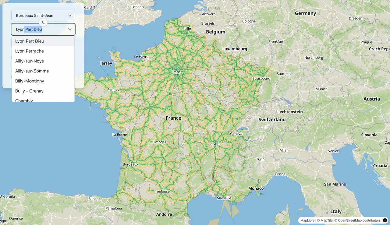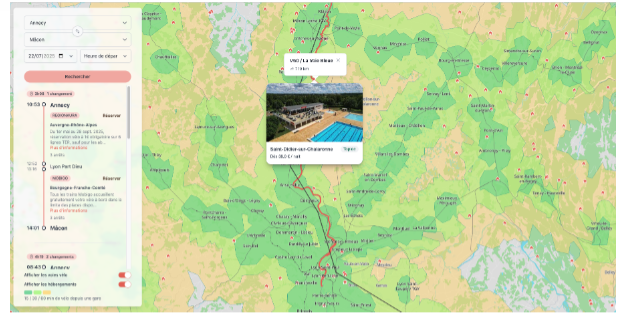 Lancé fin 2023, Vélotrain simplifie une logistique souvent compliquée : voyager en train avec un vélo non démonté. Grâce à sa carte interactive, la plateforme identifie les itinéraires cyclables connectés aux lignes TER ou Intercités compatibles avec les vélos, et fournit toutes les informations utiles : gares accessibles, correspondances, contraintes régionales, lien direct vers la billetterie SNCF.