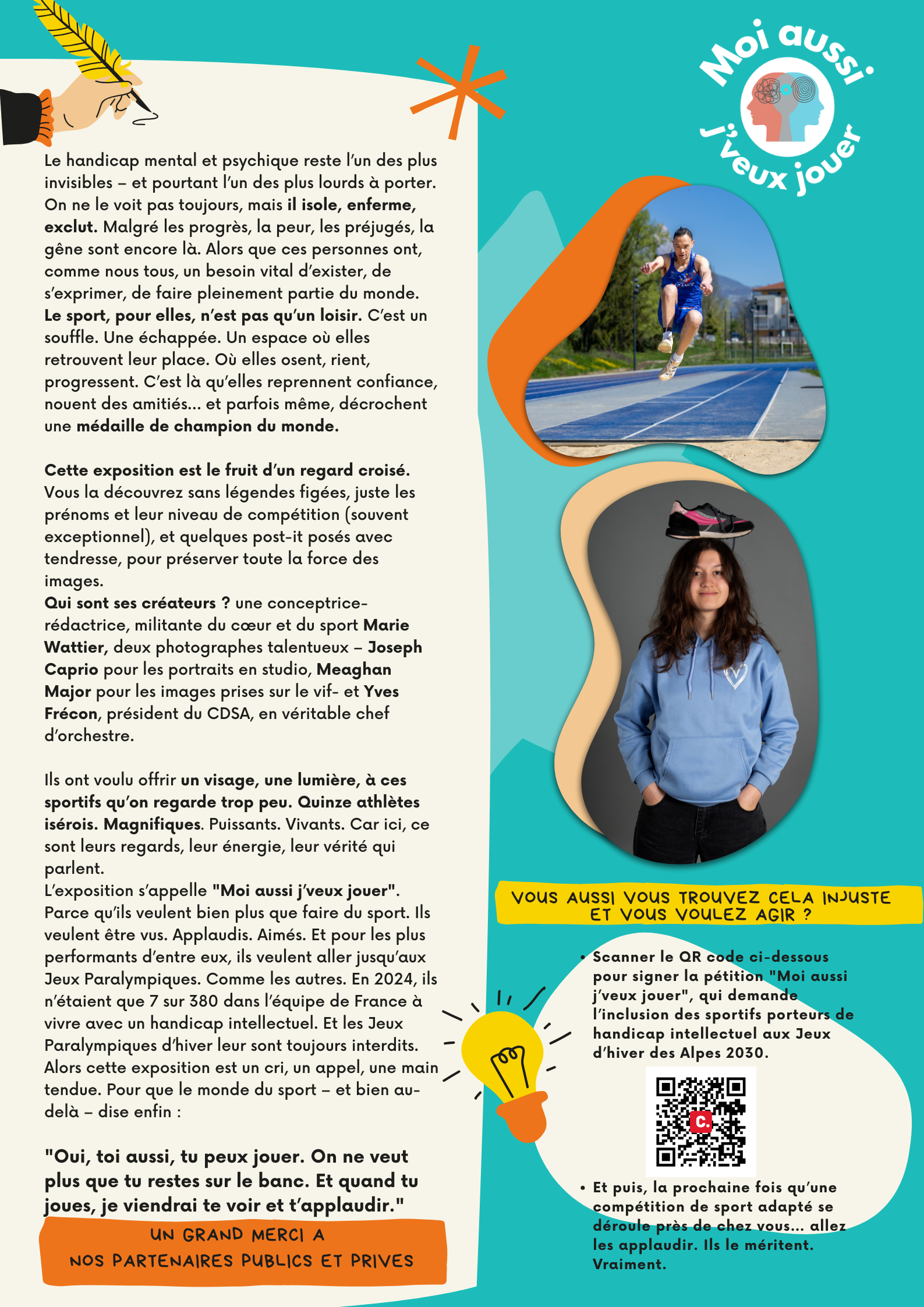 À travers des portraits poignants et des moments d’action, cette exposition porte un message fort : les athlètes en situation de handicap mental ou psychique méritent d’avoir leur place dans les Jeux Paralympiques d’hiver 2030.