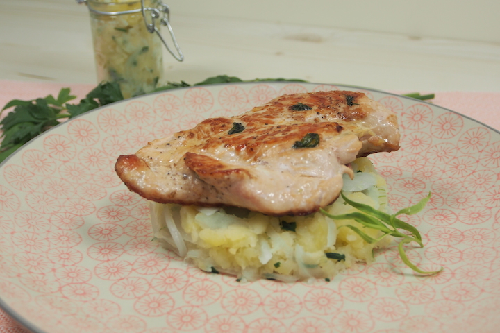 - du poulet à l’estragon, écrasé de pommes de terre aux oignons nouveaux