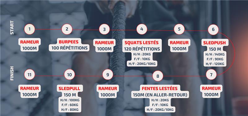 Les duos, qu’ils soient mixtes ou non, s’affronteront sur un parcours en ligne droite, rythmée par une station de rameur qui remplace la course à pied.