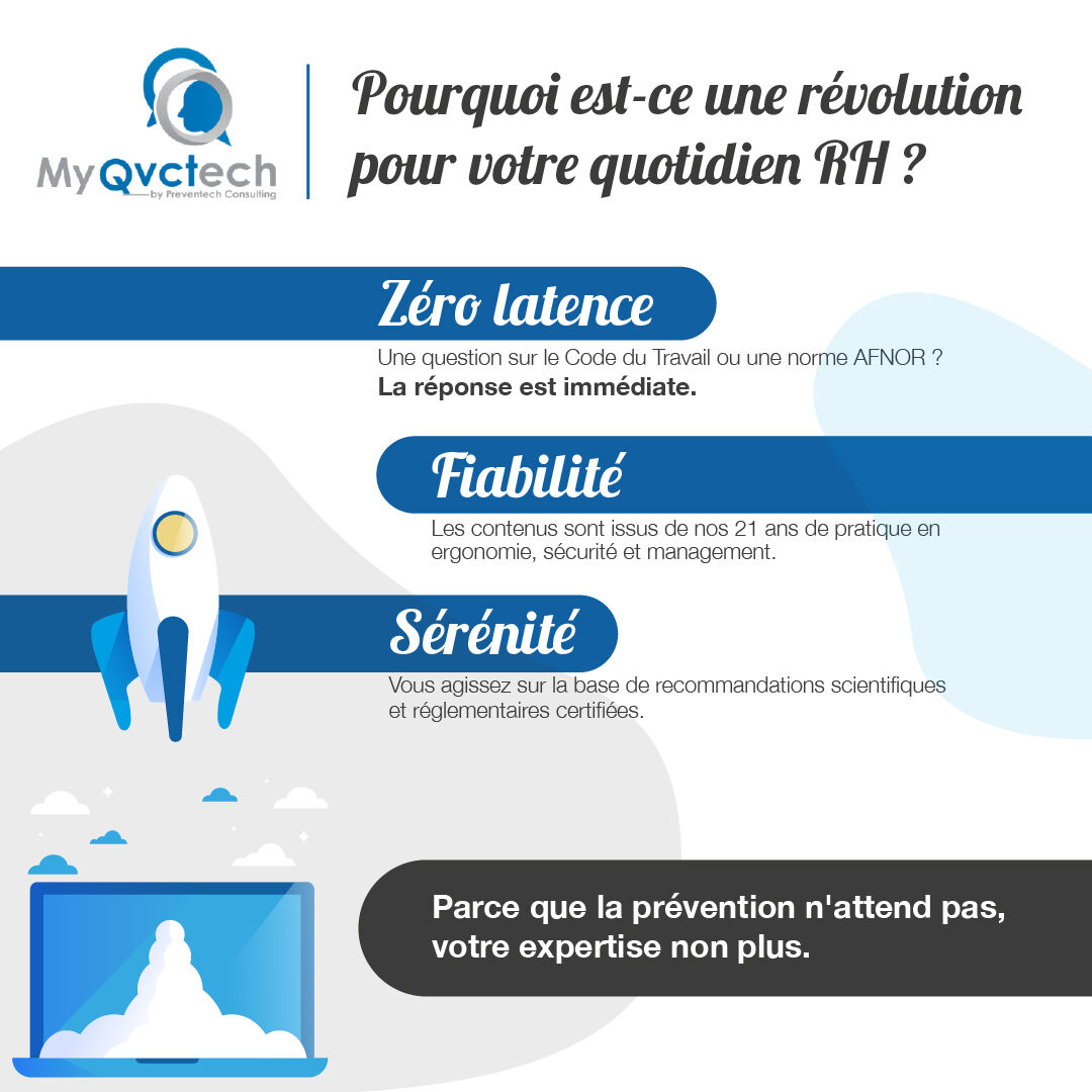 Développé à partir de 21 ans d’expertise terrain et nourri par des bases de connaissances spécialisées en santé, sécurité et conditions de travail, MyQVCTech permet d’obtenir des réponses immédiates, contextualisées et directement opérationnelles.