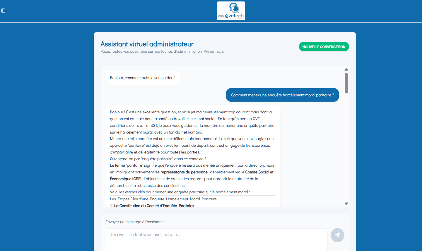En quelques secondes, le chatbot fournit un cadre structuré permettant d’analyser la situation, détaille les étapes clés d’une enquête paritaire, rappelle les obligations réglementaires applicables et met en évidence les points de vigilance essentiels, notamment en matière de rôle du CSE, de confidentialité et de traçabilité.