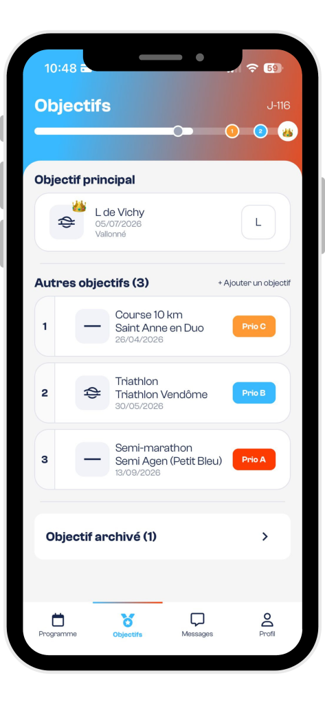 Au-delà du triathlon, Coach Kona gère l’intégralité du plan d’entraînement annuel de chaque athlète. 10 km, semi-marathon, marathon, trail, swimrun, duathlon : les objectifs intermédiaires sont intégrés au programme pour maintenir la motivation et optimiser la progression tout au long de la saison.