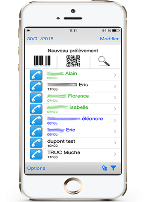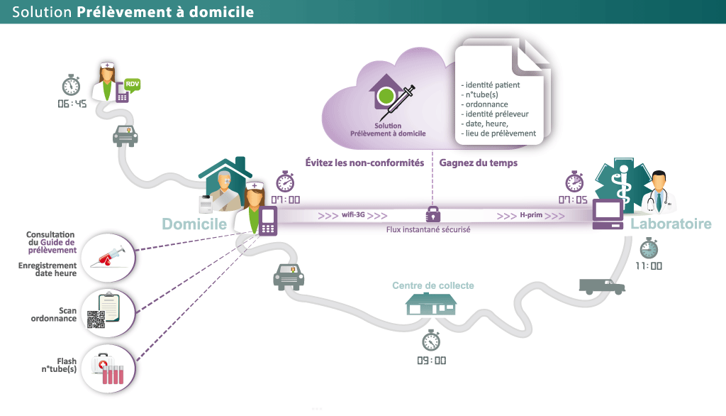 A son arrivée sur le lieu de prélèvement, à son cabinet ou à domicile, l’infirmier accède au dossier du patient via un scan-code remis par le laboratoire, enregistre le nombre de tubes prélevés et l’ordonnance. Toutes les informations sont alors directement transmises au système informatique du laboratoire qui peut ainsi commencer la vérification administrative du dossier patient avant l’arrivée des tubes quelques heures plus tard.
