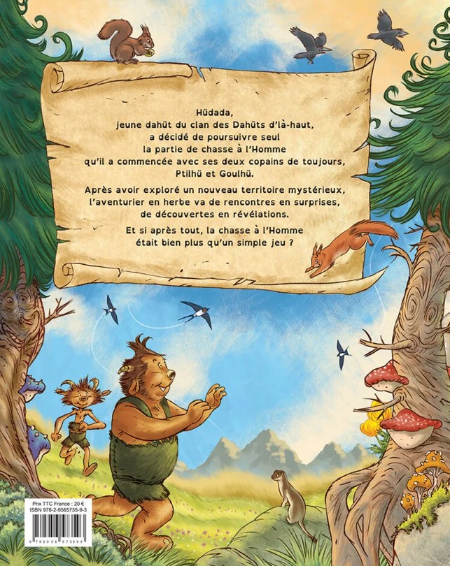 Le point de départ de l’histoire repose sur une situation simple, presque ludique : Hüdada, jeune dahüt appartenant au clan des Dahüts d’là-haut, poursuit une partie de chasse à l’Homme commencée avec ses deux compagnons de toujours, Ptilhü et Goulhü.