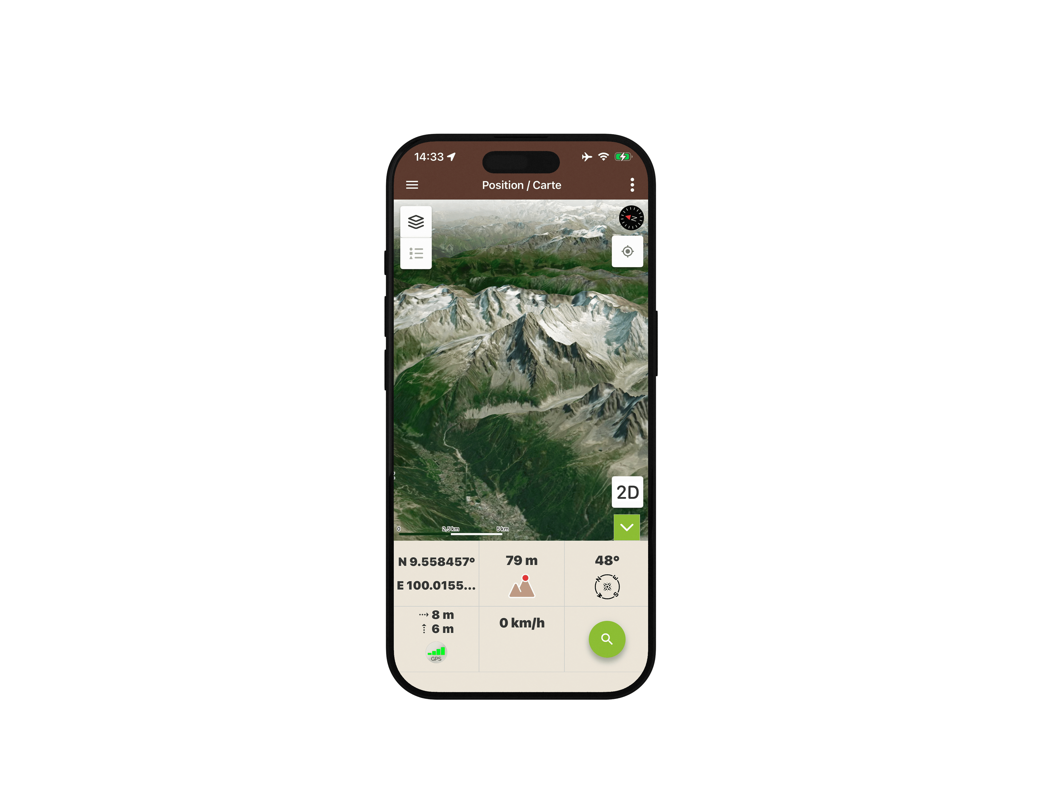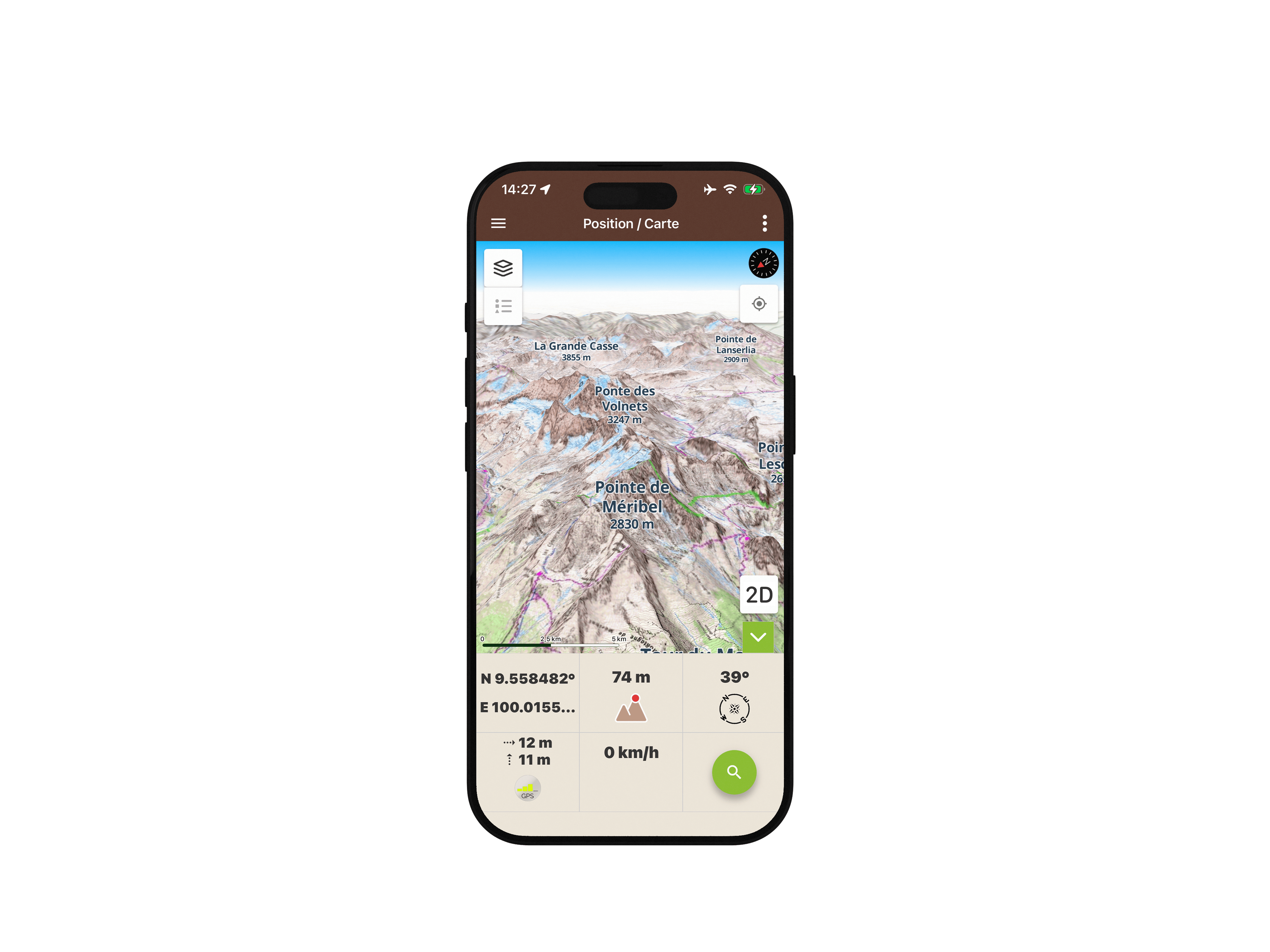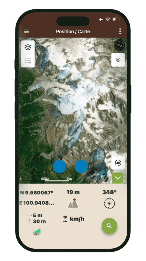 - Depuis l’écran Carte / Position, pour explorer librement une zone en 3D
