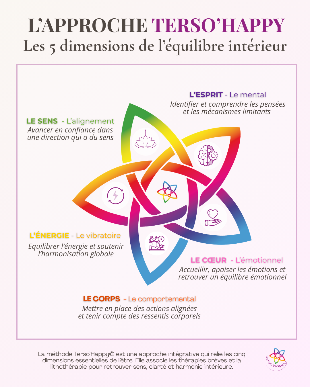 L’approche Terso’Happy© ne segmente pas. Elle ne découpe pas l’individu en compartiments étanches. Elle part d’un constat simple : les difficultés rencontrées ne se logent jamais dans une seule dimension.