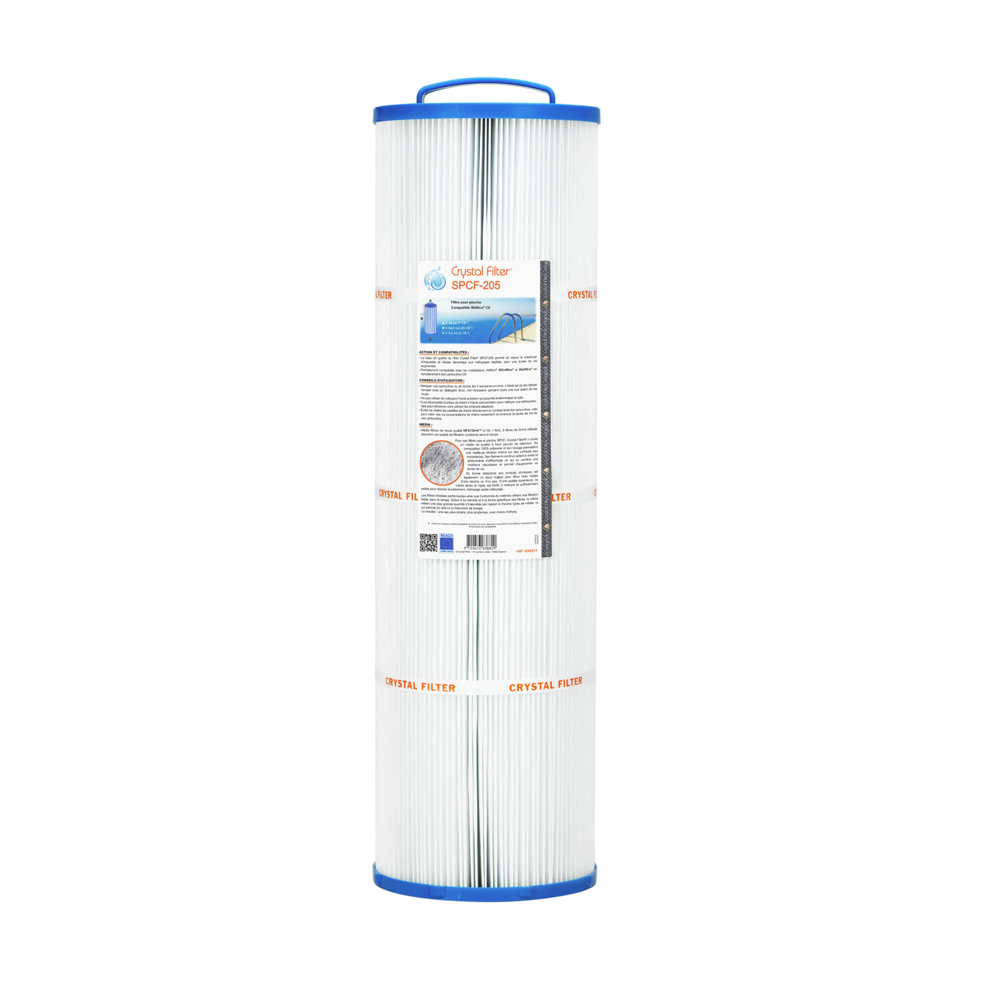 Le SPCF-205 v2, compatible avec les systèmes Weltico® C6 625 mm, se distingue par sa durabilité. Sa hauteur de 64,5 cm (poignée incluse) et son diamètre de 18 cm s’accompagnent d’un média renforcé avec support, garantissant une longue durée d’utilisation avant colmatage et une performance stable dans le temps.