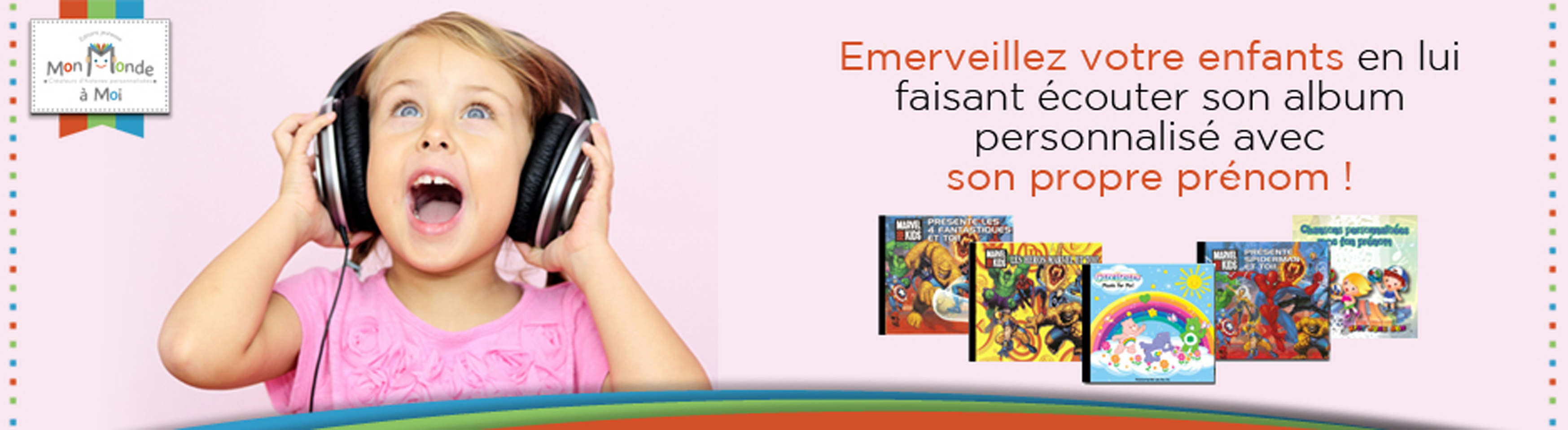 Mon monde à moi propose à tous de créer un album de chansons qui ne ressemblera qu’à votre enfant en le personnalisant : le prénom de l’enfant est cité et donc chanté plus de 40 fois tout au long du CD. Parce qu’il est important que chaque enfant ait la chance de recevoir le CD qui lui convienne, le site recense plus de 8000 prénoms dans 9 langues différentes. Chaque album comprend 8 chansons, ce qui représente une durée approximative de 28 minutes de musique originale.