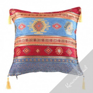 Cette housse de coussin est ornée de motifs traditionnels utilisés sur les kilims anatoliens. La bande principale de la housse incorpore des motifs d’étoiles, symboles de bonheur, tandis que la bande secondaire présente des motifs de protection contre le mauvais sort (œil) et les animaux sauvages (scorpion). Ici présentée en bleu et rouge, cette housse est disponible dans plusieurs associations de couleurs.