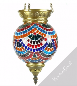 Témoignage des traditions byzantines et ottomanes entre autres, c’est à travers une mosaïque de carreaux de verre coloré et de laiton que cette lampe diffuse, à la manière d’un kaléidoscope, une lumière ouatée.