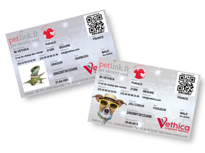 Pour permettre aux Français d’équiper leurs animaux, tant domestiques que NAC, en éléments d’identification et permettre de les retrouver facilement en cas de perte, Véthica a mis au point la solution 2 en 1 associant la « Pet Identity Card » à l’identification électronique et à la médaille Véthica. Désormais avec le n° d’identifiant de la Pet Identity Card ou celui de la médaille, il est possible de connaître l’identité des animaux et de leur propriétaire.
