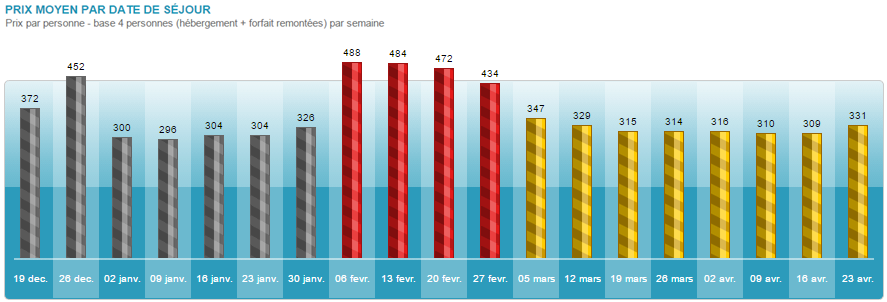 Selon le baromètre 2016 Ski Express, la semaine du 16 avril sera la moins chère de ces prochaines semaines avec un séjour coûtant en moyenne 309 € par personne (hébergement + forfait sur la base de 4 personnes). Les vacances de pâques proposent des prix intéressants avec un tarif moyen moins élevé que le mois de mars, période hors vacances scolaires (313 € contre 325 €).