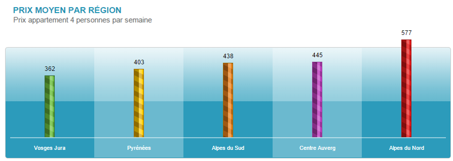 En moyenne, les tarifs pour un appartement de 4 personnes sont compris entre 362 € dans les Vosges et 577 € dans les Alpes du Nord selon les derniers tarifs mis à jour.