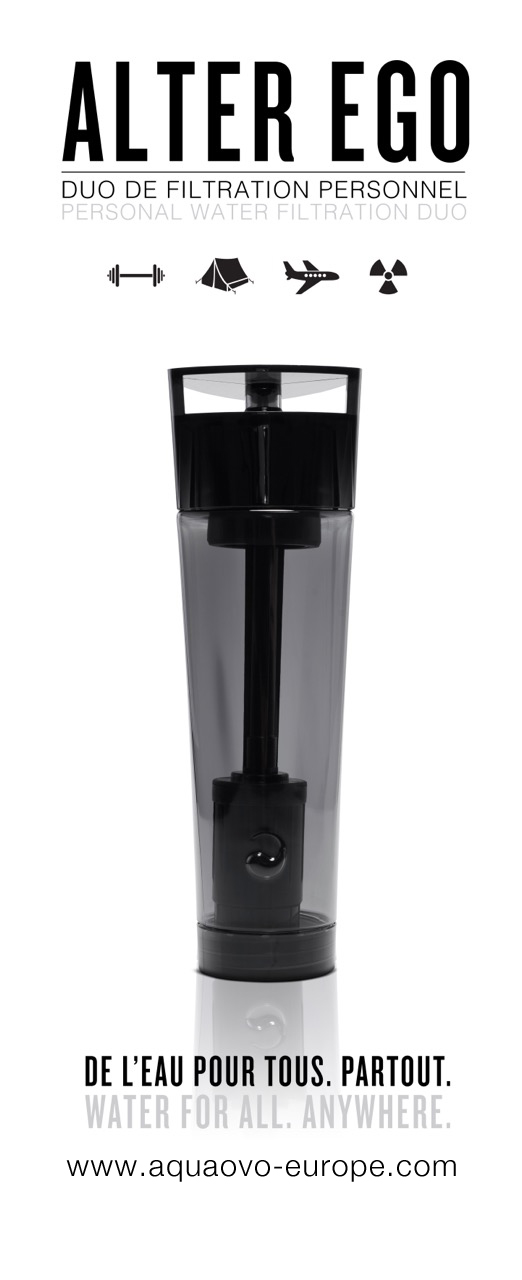 Alter Ego est le nom de la nouvelle bouteille filtrante, proposée aux personnes nomades par la société 1r design, importateur français exclusif des produits de la marque québécoise Aquaovo.