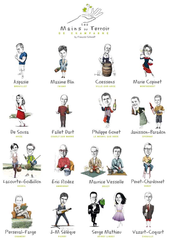 La Côte des Blancs, la Vallée de L’Ardre, la vallée de la Marne, la Montagne de Reims, la Côte des Bar, le Sézannais… Les Mains Du Terroir de Champagne réunit seize vignerons issus d’autant terroirs différents dans l’AOC Champagne. Chaque vigneron membre représente son terroir, son sol, son style.