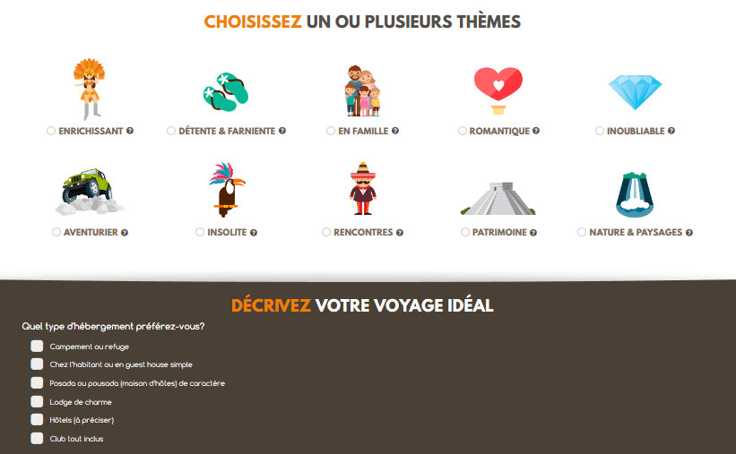 Le client sélectionne d’abord sa ou ses destinations préférées puis précise son planning et quelques informations pratiques sur les différents participants du voyage. Il est ensuite invité à pré-sélectionner ses attentes parmi un choix de dix thématiques, puis à préciser par écrit ses envies ainsi que le type d’hébergement privilégié et son budget indicatif.