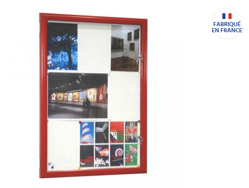 - la vitrine d’affichage d’extérieur : étanche sur les quatre côtés et naturellement ventilée, cette vitrine rouge en sécurit de 4 millimètres d’épaisseur se fixe au mur ou sur piétement, et permet d’afficher les informations importantes pour les entreprises ou les collectivités. La porte est démontable et une serrure est installée dans le vitrage en plexi. A partir de 150 € HT.