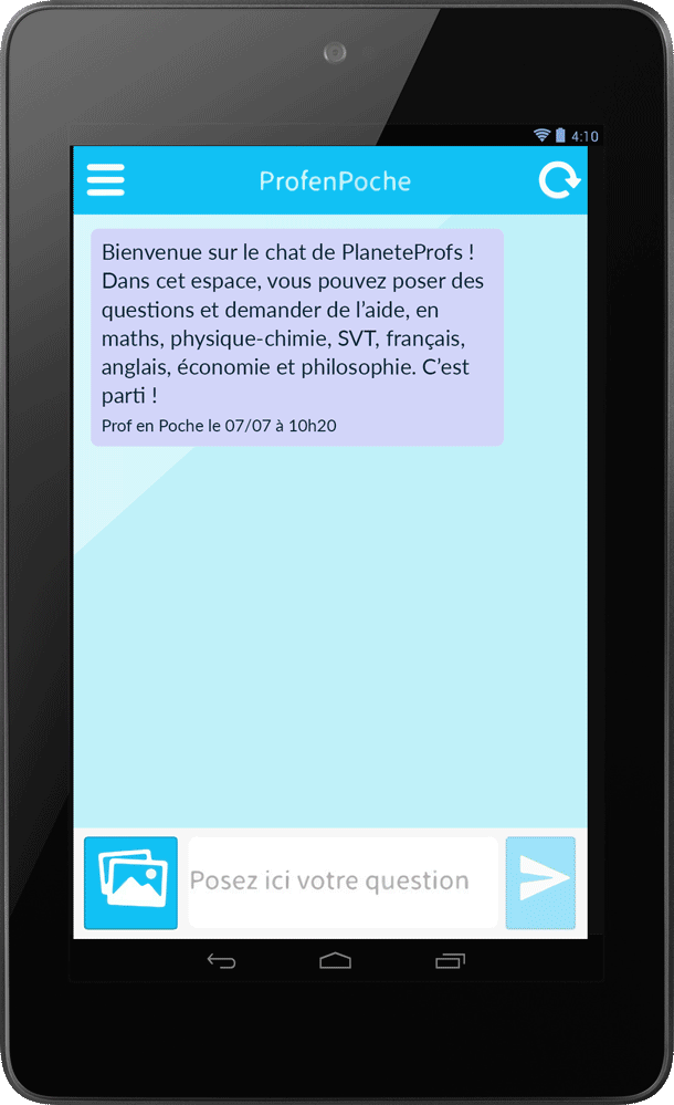 L’élève peut, via l’application mobile “Prof en Poche”, à n’importe quel moment de la journée, du soir ou du week-end, poser des questions ou envoyer la photo d’un exercice et recevoir des réponses rapides de profs, en maths et physique-chimie.