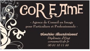 Installée en Alsace, à Turckheim plus précisément, Sandrine Bourderionnet, diplômée de l’Institut De Relooking International de Paris (école reconnue par l’Etat) a créé en 2012 l’agence CorEame. A travers ses prestations de conseil en image, de relooking et de personal shopping, à destination des particuliers, des associations, écoles ou entreprises, Sandrine Bourderionnet propose une approche de valorisation de l’image dans le respect de la personnalité de chacun.